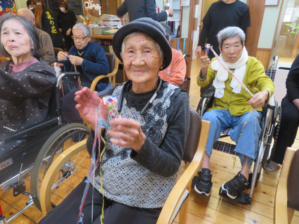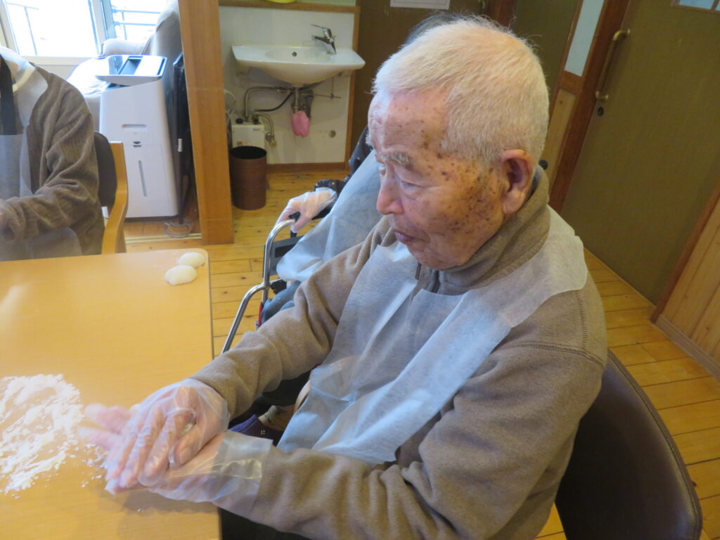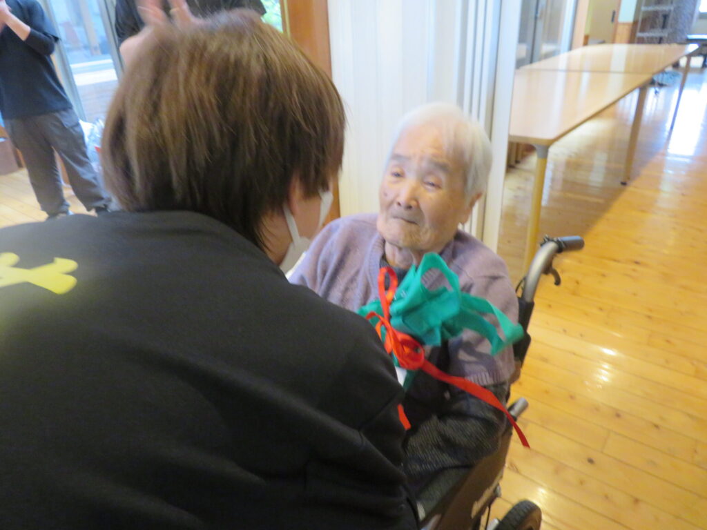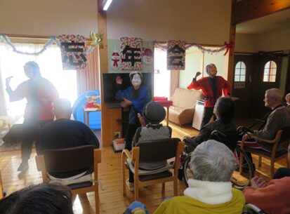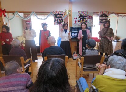 一年の締めくくりとして餅つき大会と忘年会を開催いたしました。いつもとは少し違う特別な雰囲気の中で皆さまをお迎えしました。ご挨拶とともに会が始まると、午前中は餅つき大会、午後からは忘年会を開催。職員によるアトラクションや外部ボランティア(ブルーム)による合唱では会場は一体感に包まれ自然とリズムに合わせ手拍子が起こり、皆さまの表情も笑顔になられていました。
