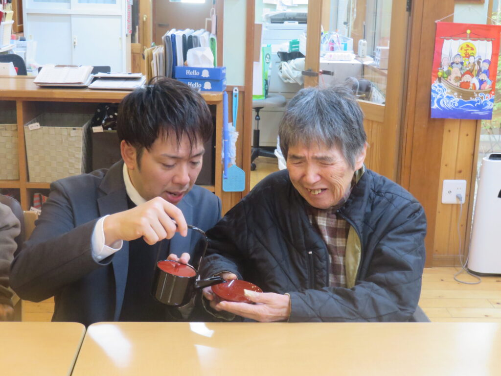 R8.1.1 2026 2/28 目次新年あけましておめでとうございます。菜の花でも恒例のお正月行事「お屠蘇」を行いました。皆さまに順番にお屠蘇をお配りし「今年も元気に過ごせますように」と願いを込めて口にしていただきました。新年の晴れやかな雰囲気の中、自然と笑顔がこぼれ和やかな時間が流れました。 謹賀新年 お正月 活動内容 R7.12 R8.1 関連記事 R8.1 2026年2月28日 R7.12 2026年2月28日 R7.11 2025年12月12日 R7.10 2025年11月12日 R7.9.16 2025年10月29日 R7.8 2025年9月22日 R7.7.7 2025年8月16日 R7.7 2025年8月16日