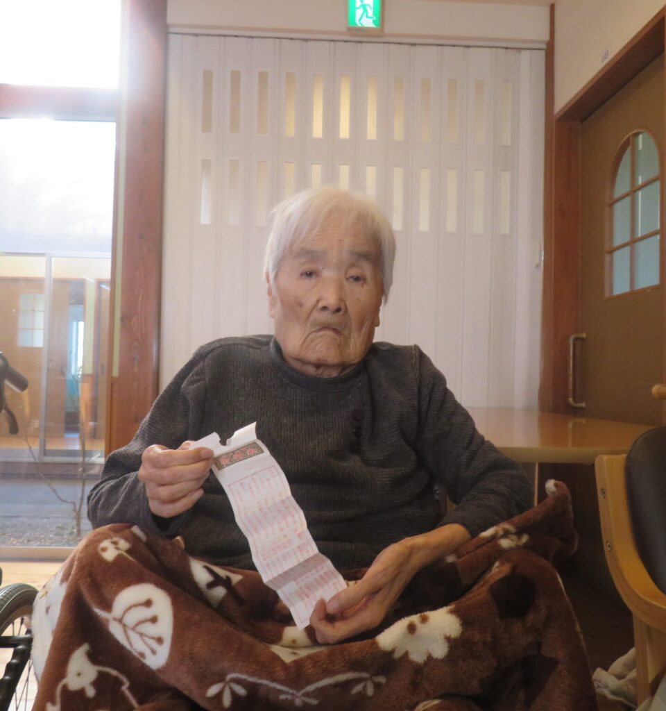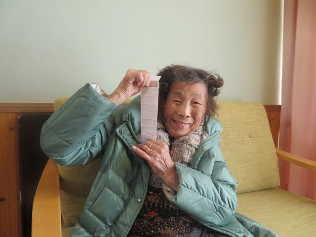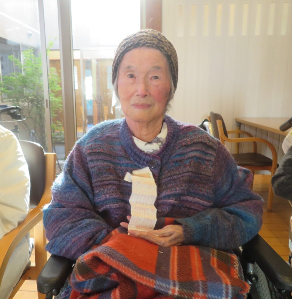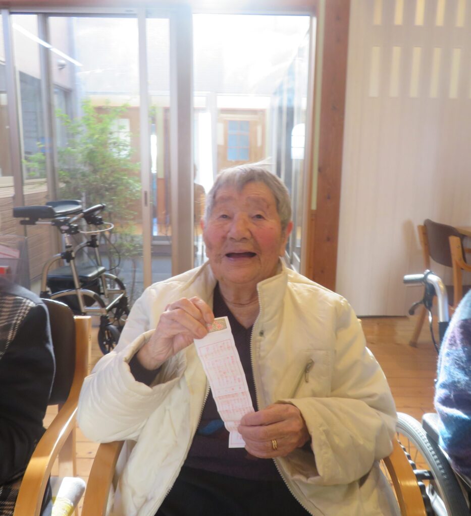 職員が神社のおみくじをまとめて購入し、施設内で「おみくじ大会」を開催しました。お一人ずつ順番に引いていただくと、それぞれの結果に笑顔や驚きの声が上がりました。皆さまに新年の雰囲気を感じていただけるひとときとなりました。
