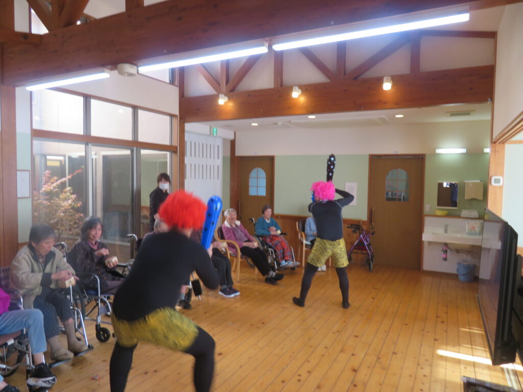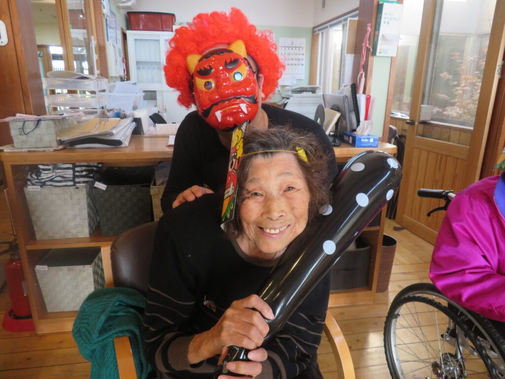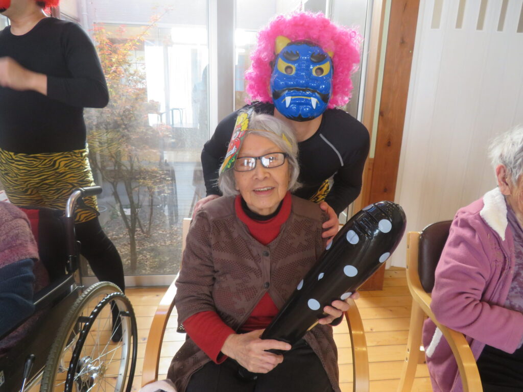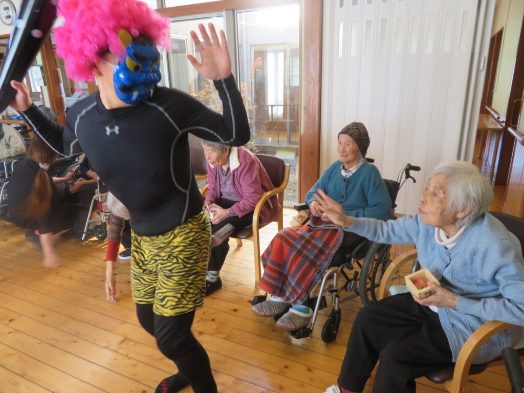 節分の日に豆まきを行いました。鬼が登場すると、皆さん少し驚きながらも笑顔で「鬼は外!福は内!」と元気よく豆をまき、鬼退治を楽しみました。会場には笑い声があふれ、和やかな雰囲気の中で一年の健康と幸せを願う楽しいひとときとなりました。
